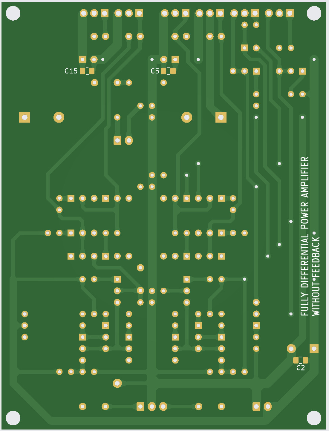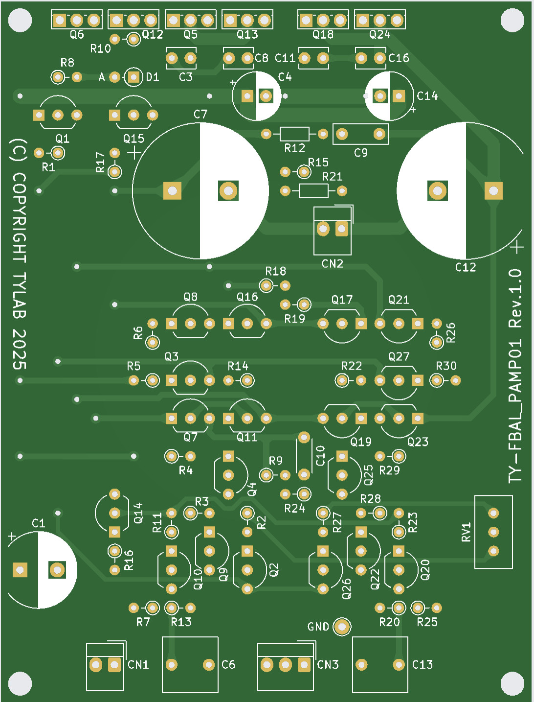 2024年の6月に制作していた差動パワーアンプを、PCB化して量産してみようと思い立ち、KiCADを立ち上げる。部品のレイアウトは、以前試作した際の秋月のBタイプ基板(95x72mm)と同じくする。試作時に、あらかじめ配線も検討してあって、その時の片面配線+ジャンパ配線から、両面配線でPCB化する。バイアス関係の配線、FETへの配線がジャンパだったので、これをどうにかしたい。KiCADとにらめっこが続く。