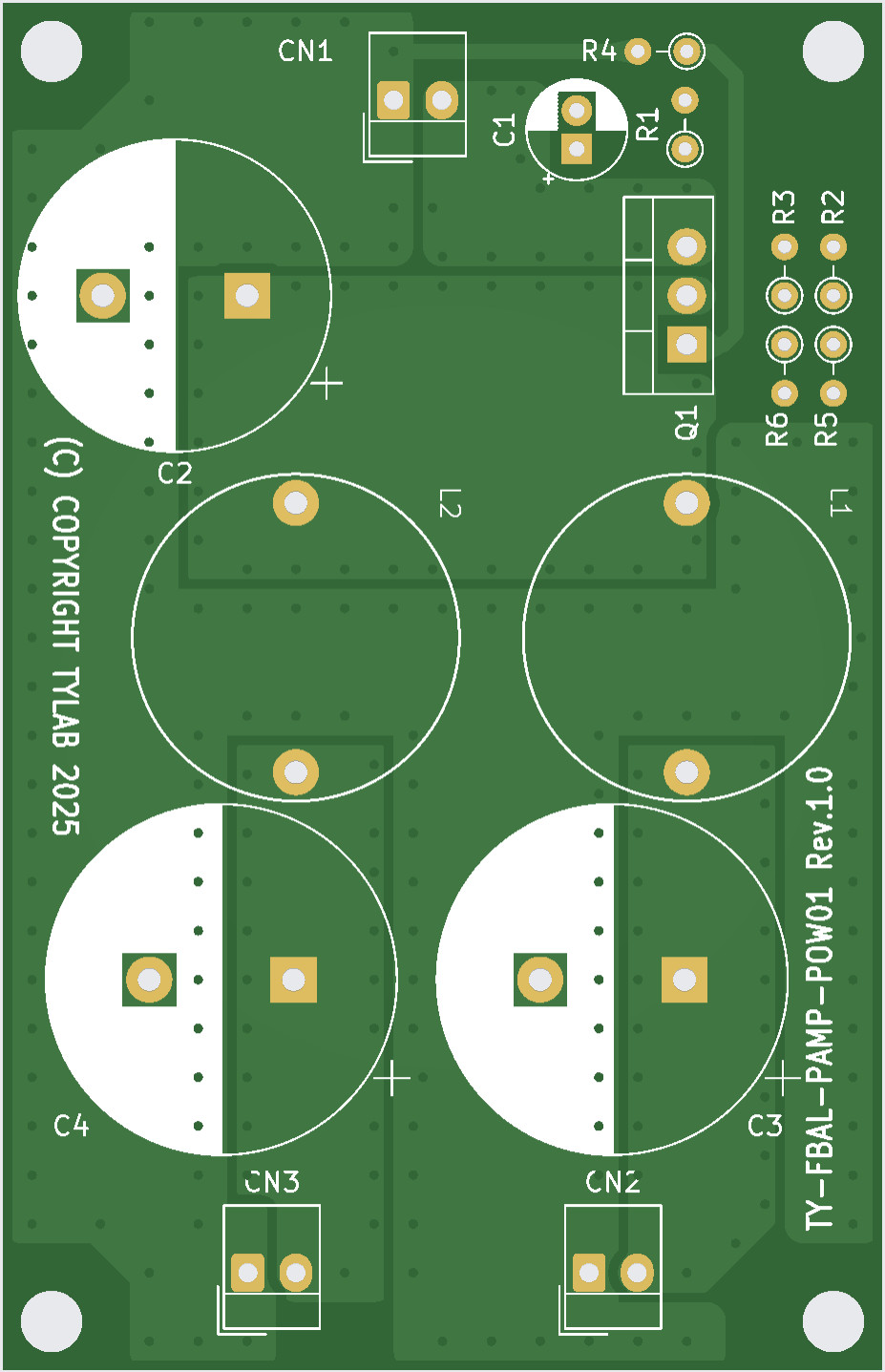 両面配線を駆使しつつ、部品面を左右方向、半田面を上下方向で整理して、配線を見直す。ようやくパワーアンプ部が形になる。次は、突入防止と電源のπ型フィルタを搭載した電源基板もさっくりと作成する。こちらはCタイプ基板で作る。